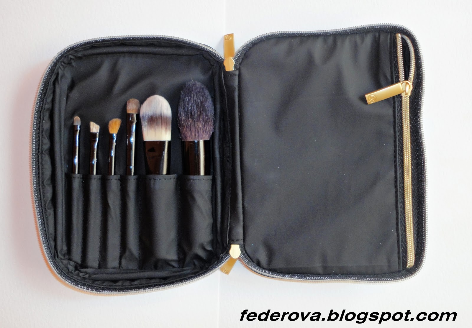 A fost dragoste la prima vedere, ca si in cazul primului meu set. Mi-a placut mult tocul, forma, materialul foarte finut al tocului, pensulele asa mici si dragalase…marca, dar NU si pretuuull :)). Oricat de mult mi-a placut a fost o greseala sa risipesc 80 euro pentru el. Setul este format din 6 pensule care nu sunt numerotate sau etichetate ca cele de la Estee, dar setul era insotit de o carticica cu indicatii de utilizare a acestora.