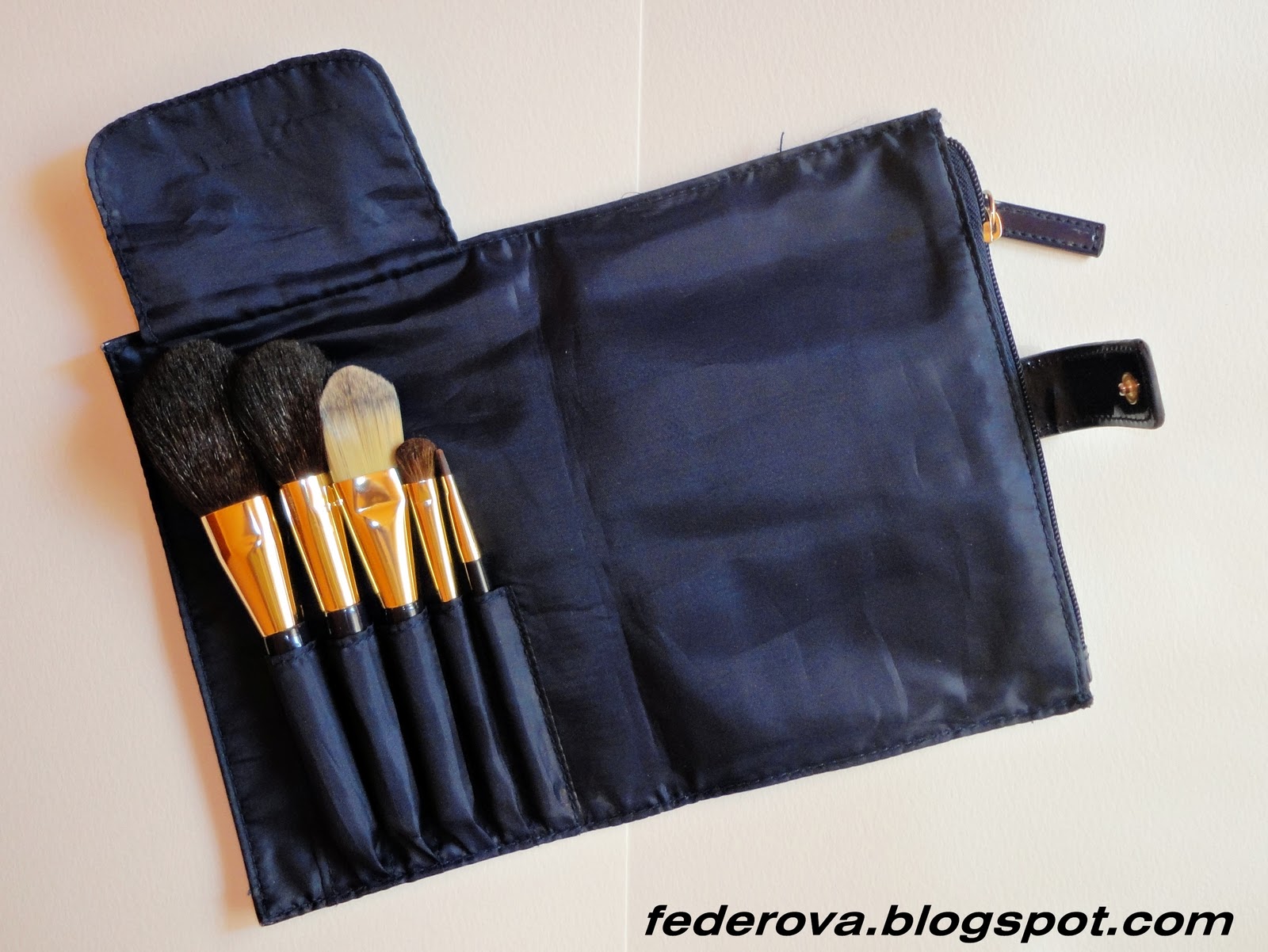 Pensulele sunt puse in compartimente diferite, iar in dreapta lor se afla un alt compartiment cu fermoar destinat altor instrumente de make-up. Parul din care sunt facute cred ca este diferit de la pensula la pensula, cea de fond de ten de exemplu este fooarte moale si fina, sintetica deloc, iar cea de sprancene este foarte aspra si rigida. In ansamblu imi plac, desi sunt mici si la inceput aveam impresia ca imi scapa din mana, apoi m-am obisnuit cu marimea, sunt ideale pentru calatorii si pentru o mica dependenta de “carat farduri in geanta peste tot” ;)).