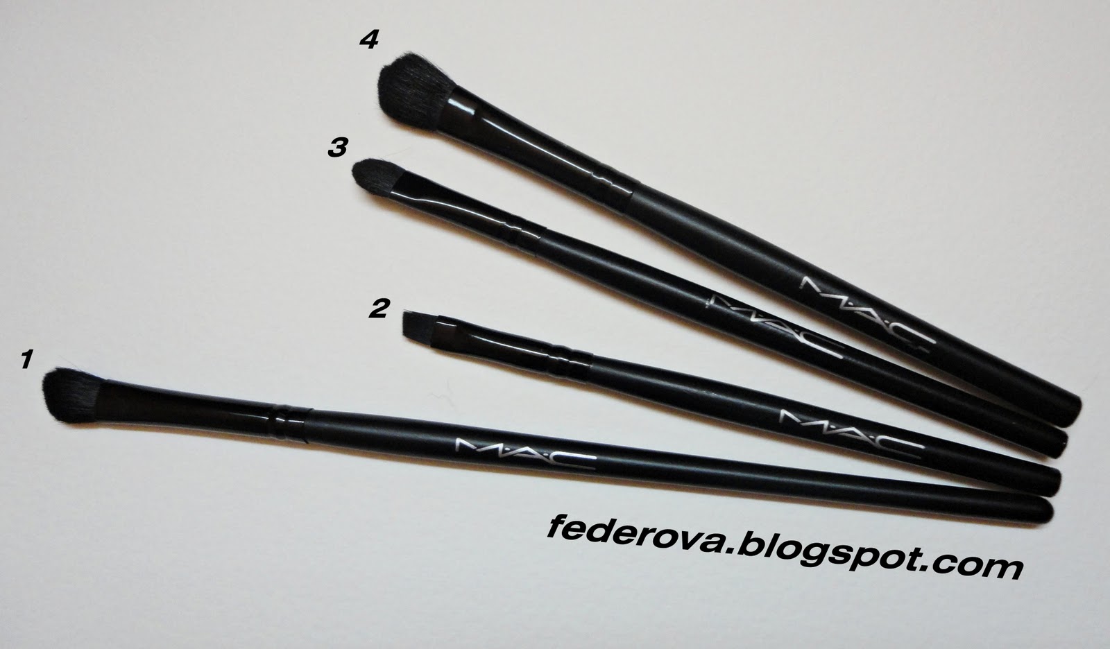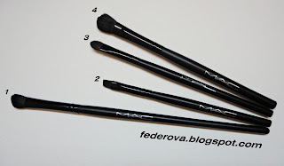 Pentru ca m-am obisnuit cu pensulele mici, iar cele de la “mac” (replici) erau prea lungi, le-am taiat la capete cu bomfaierul si le-am vopsit frumos cu oja neagra.:))…Acum incap in toate gentutele mele de farduri minuscule ;)). Pensula nr 1. este una normala iar de la 2 la 4 au suferit “interventii chirurgicale pentru scurtare” ;)).