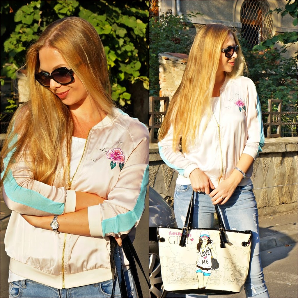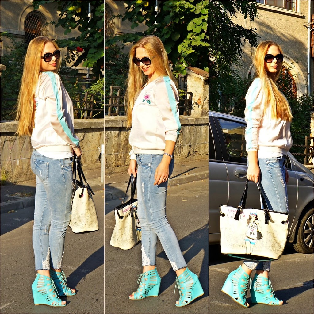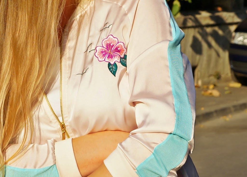 De obicei eu nu port pantaloni cu aplicatii, dar dantela la ai tai e asa de faina! Jachetica e asemanatoare la material cu halatele satinate/matasoase de casa. 🙂