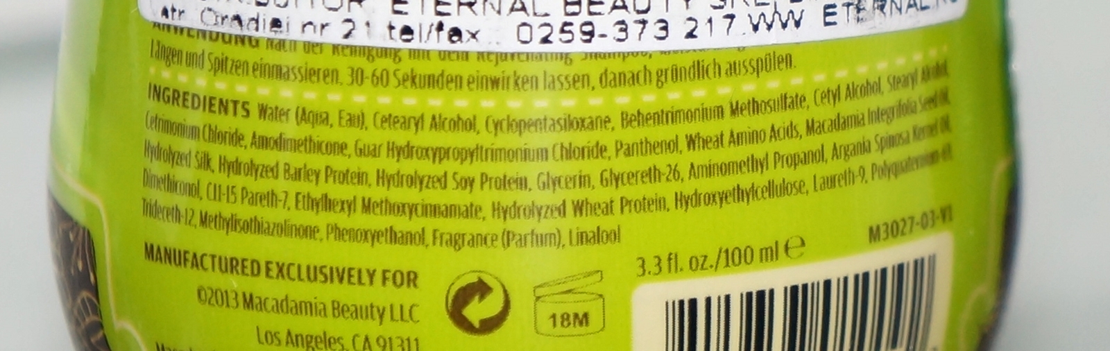 Ulei de Macadamia, omega 5, omega 7 și omega 9, 3 acizi grași, Panthenol, vitamina B5, ulei de argan.