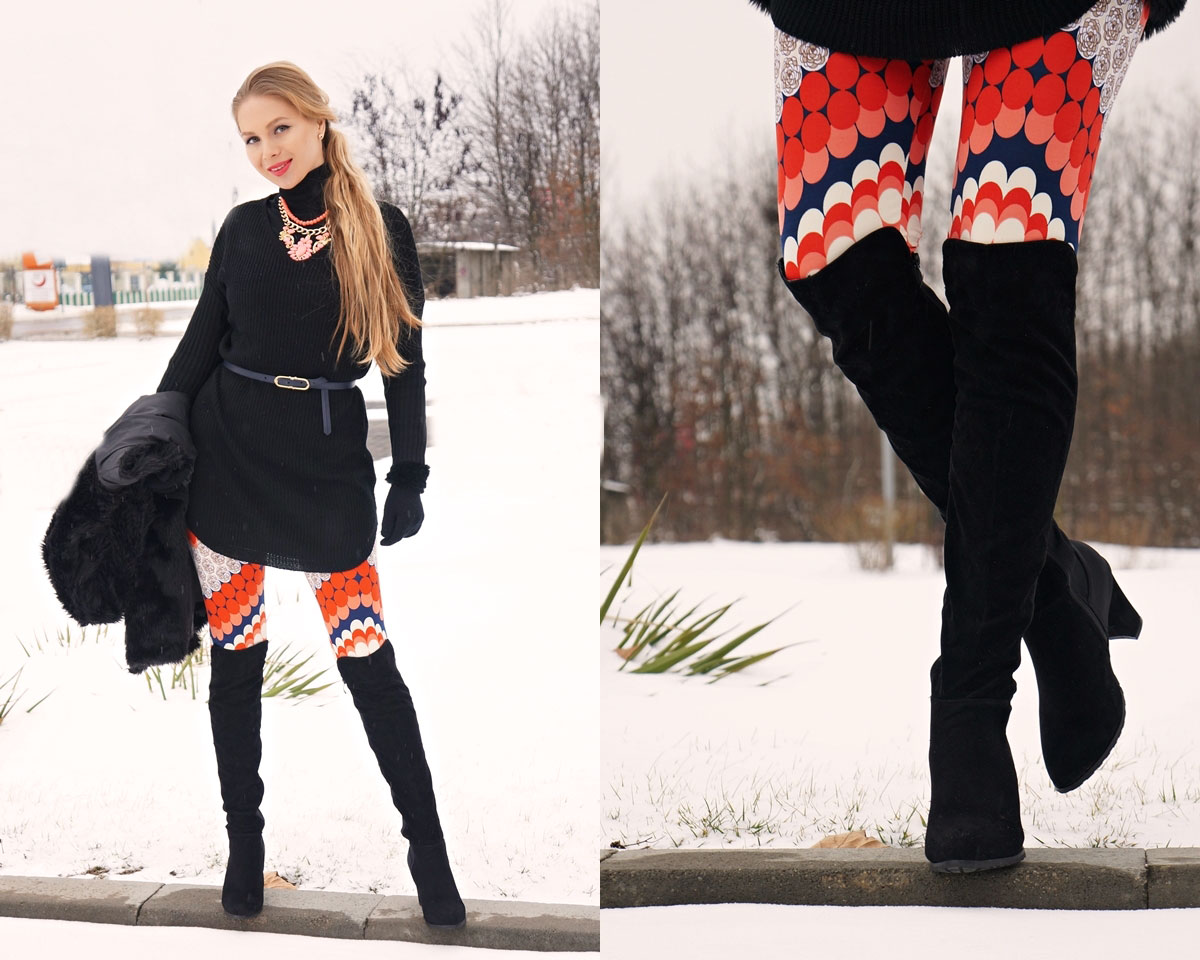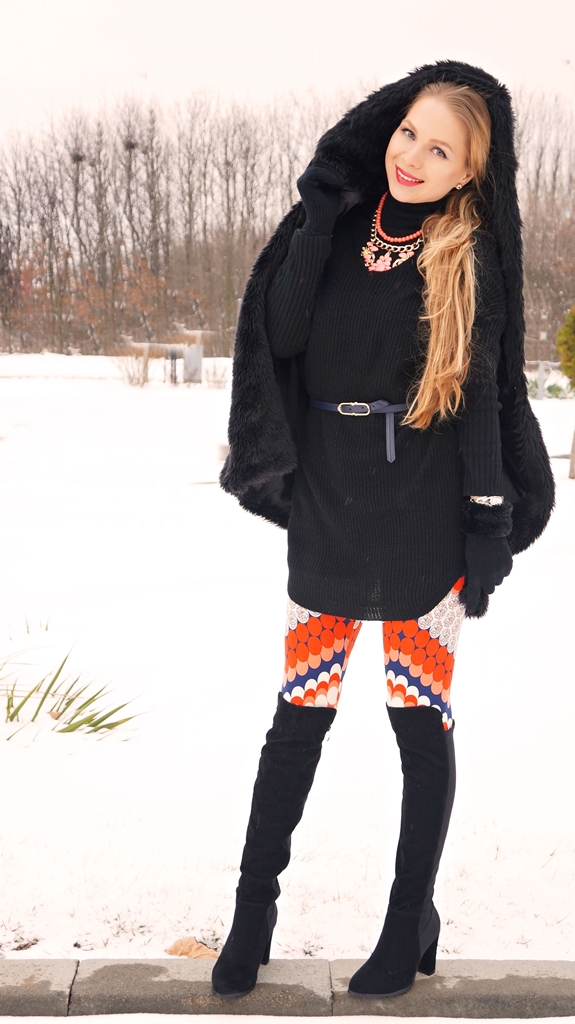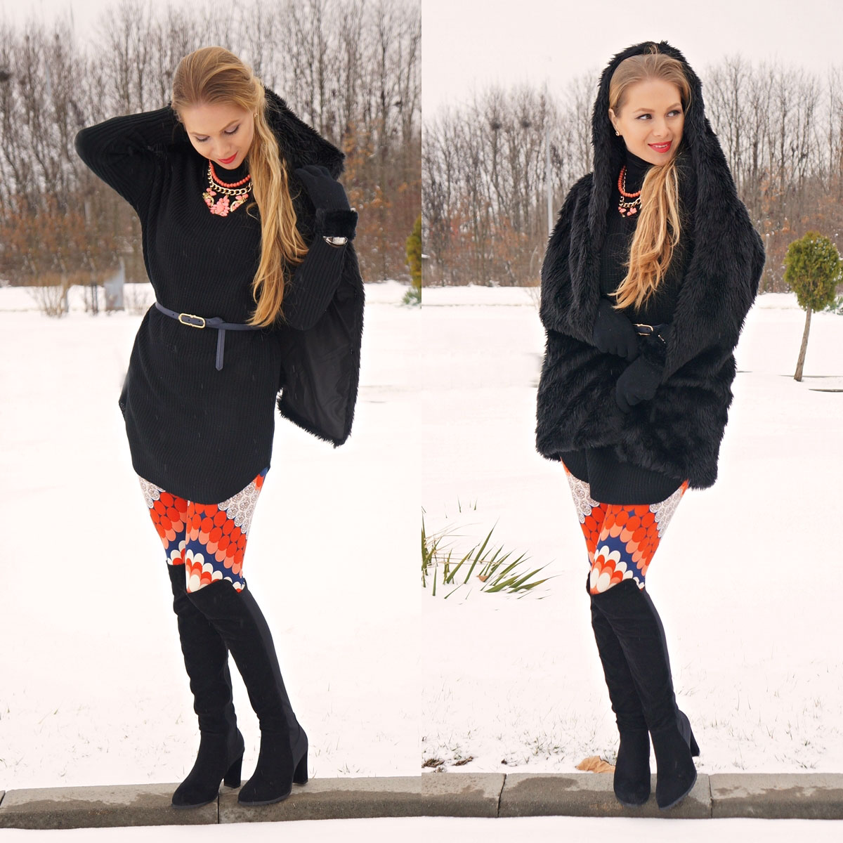 Puloverul rochie este întotdeauna o alegere bună și ca să nu fiu all black am zis să asortez niște colanți colorați cu un colier masiv.