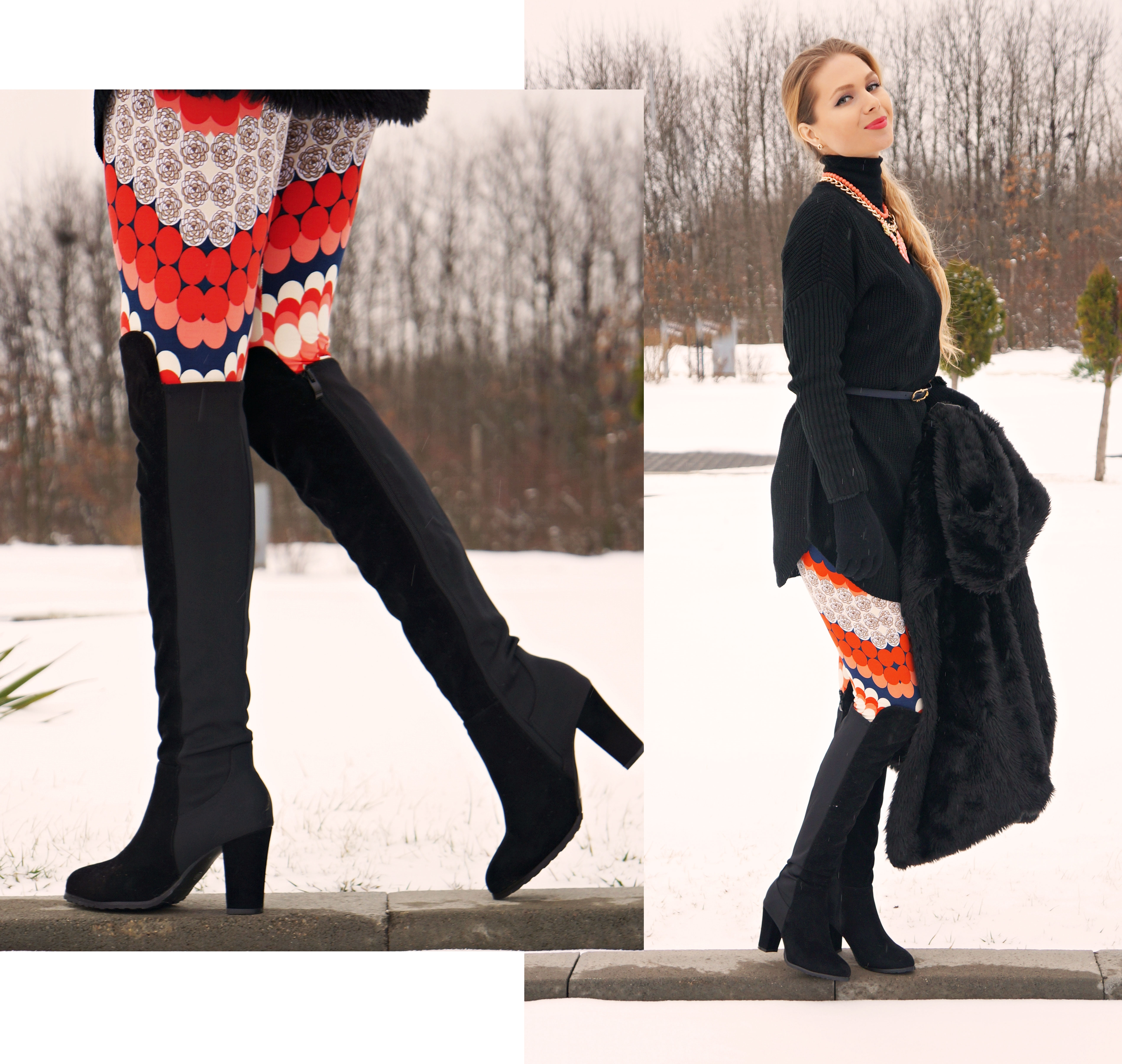 Cizmele sunt cumpărate recent de AICI și în ciuda faptului că sunt foarte subțiri (potrivite pentru primăvară/toamnă), îmi plac și mă simt foarte bine în ele. Au tocul potrivit ca mărime dar și ca grosime, plus că mă avantajează faptul că îmi acoperă genunchii.
