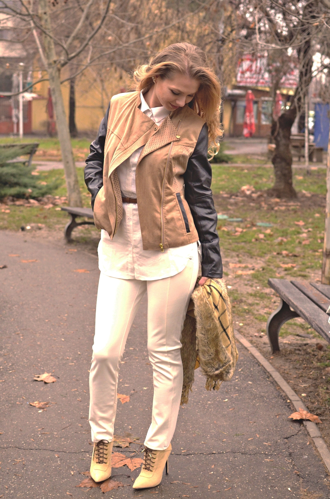 Botinele le-ați văzut în postarea precedentă și m-ați cam întrebat de ele. Modelul e extrem de frumos și bine gândit după părerea mea. Vă spuneam că au în dreptul călcâielor banda aceea maro care e un elastic de fapt. Sunt foarte comode datorită acelui elastic dar buba pare să fie tocul. Eu m-am dezobișnuit total de tocuri atât de înalte și mi s-a părut destul de dificil să merg normal. Tocuri înalte în picioare, frig rău, vânt puternic, mocirlă și rahați de câini pe alocuri, fața mă strângea și nasul îmi curgea, le aveam pe toate. Deci imaginați-vă ce mers de căprioară puteam să am eu în astfel de condiții 😳 .