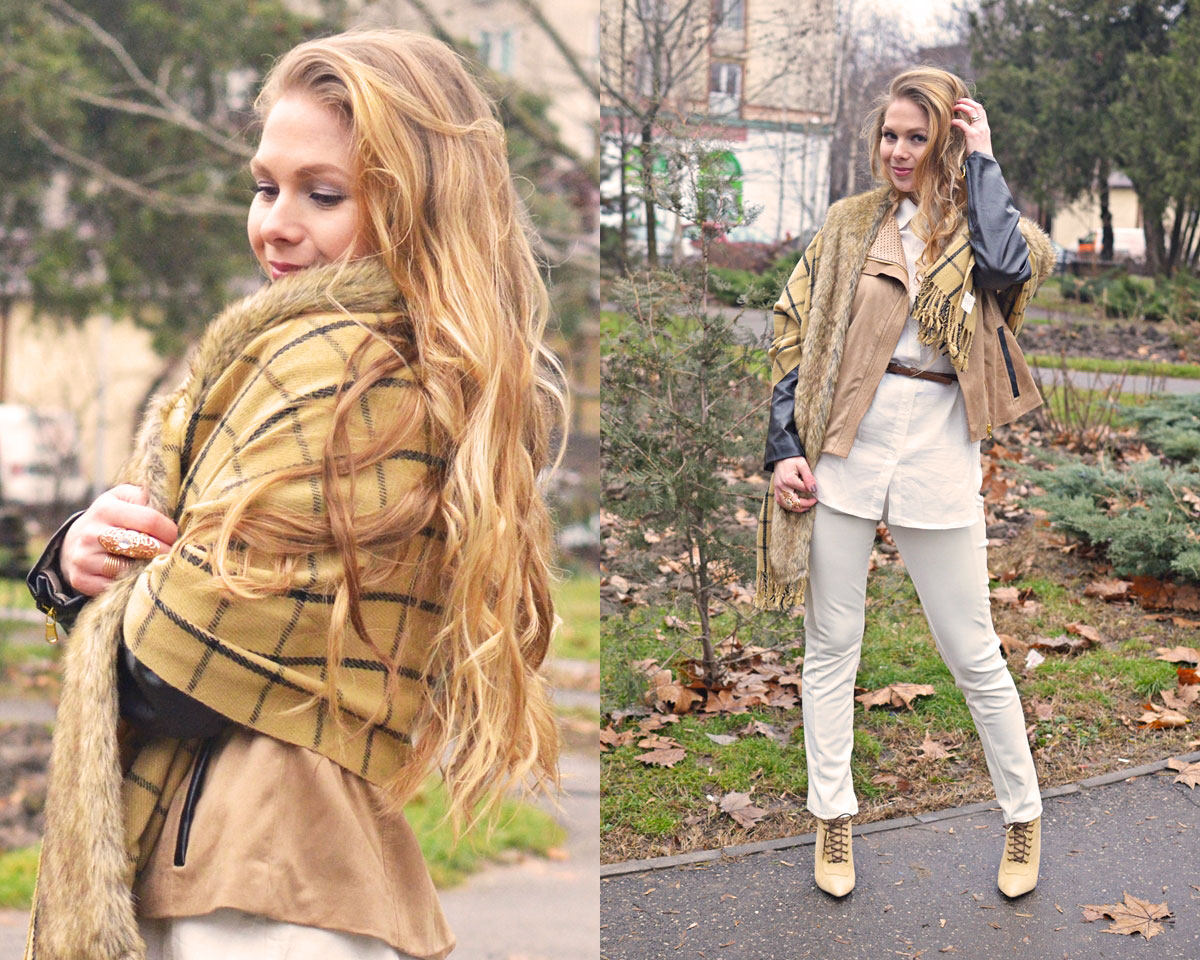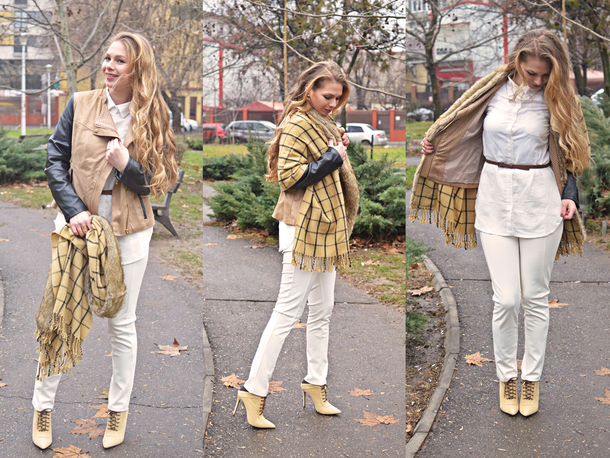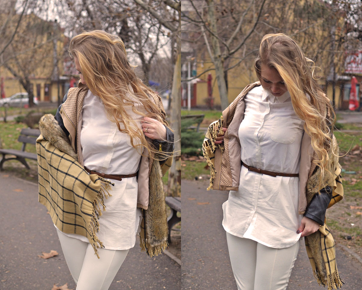 Vreau să laud în mod special cămașa albă cu etichetă Inditex care îmi place la nebunie și abia aștept să o port la primăvară. E puțin transparentă dar nu așa rău încât să par obraznică. Am găsit-o AICI la un preț destul de mic. Foarte încântată mă declar și de fularul cu blăniță care mi s-a părut super interesant ca model. Scoate orice ținută din anonimat, poate fi purtat în multe feluri și e și călduros. I love it!