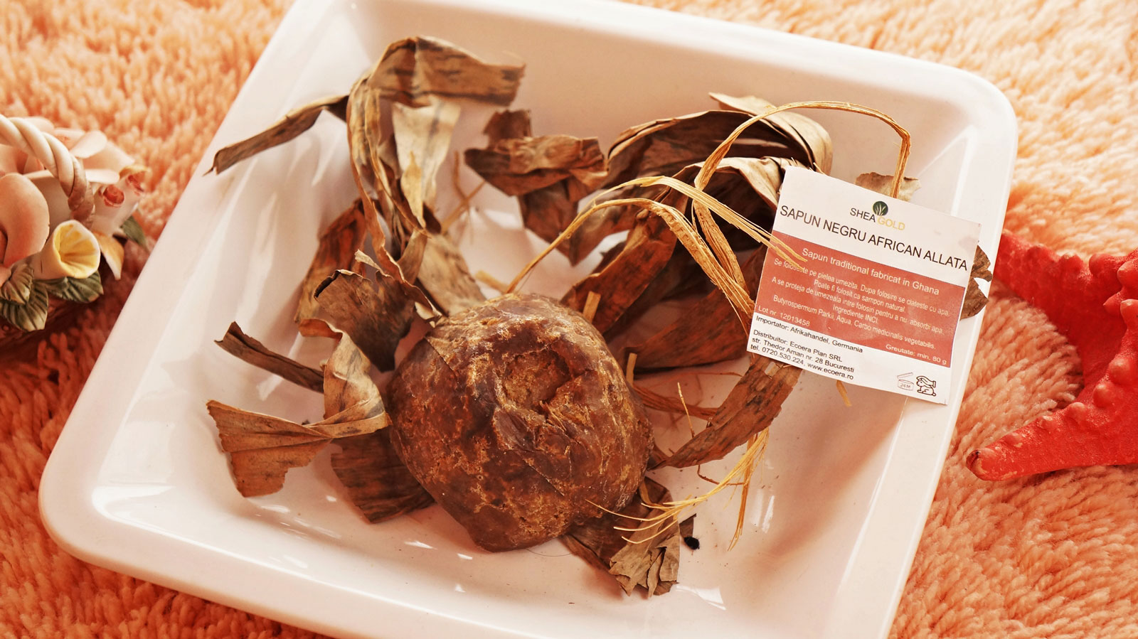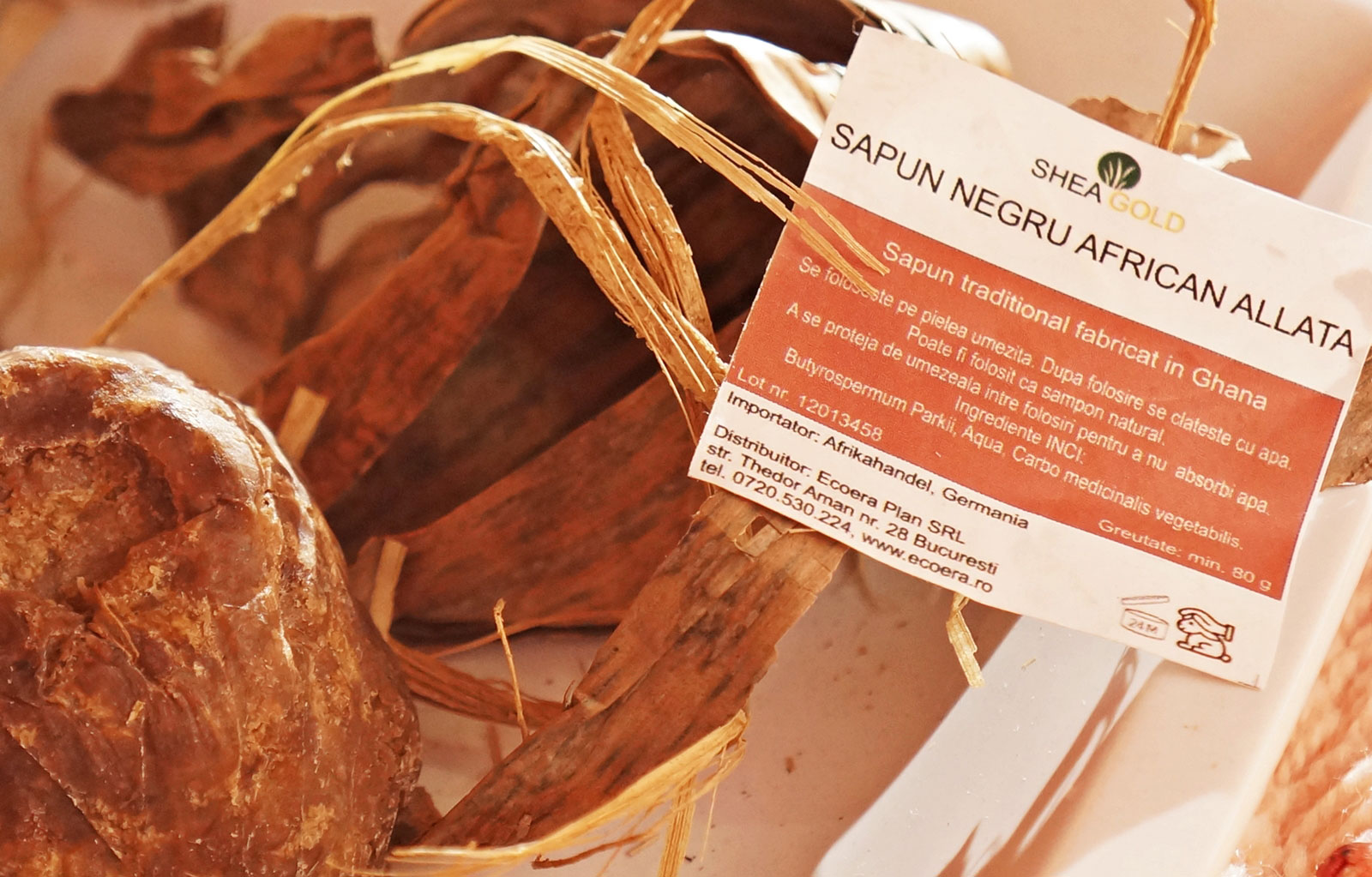 Am avut un șoc când l-am primit. Îl știam din pozele de pe site dar altceva a fost să îl văd în realitate. Felul în care era ambalat în frunze uscate de banan și forma lui neregulată m-au convins că e un săpun african tradițional.