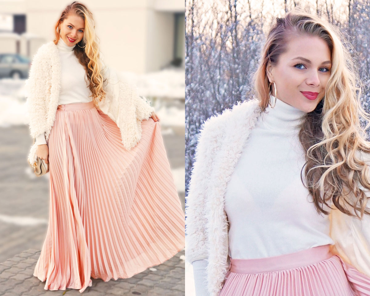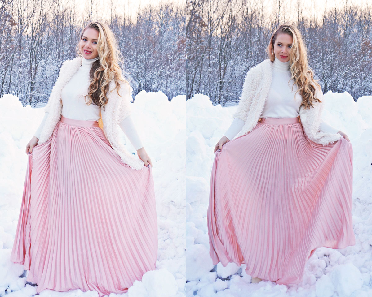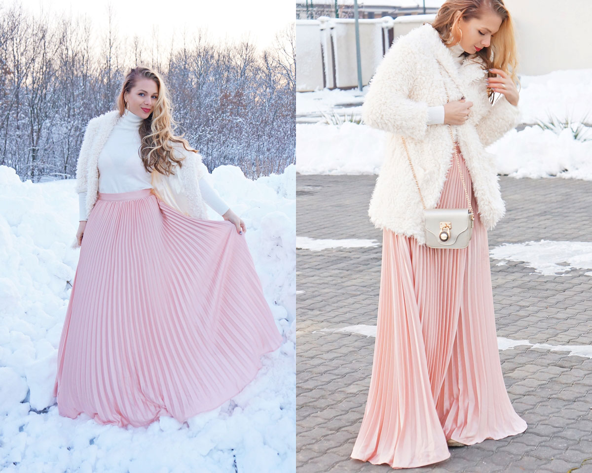 Fustă maxi iarna? De ce nu? 😀 Am visat zile întregi la minunăția asta. Doar după ce am văzut-o la câteva bloggerite m-am decis să o comand și eu într-un final. Am așteptat-o cu sufletul la gură și chiar dacă știam că e total nepotrivită pentru vremea rece, eu eram super nerăbdătoare să o port, cu haine groase deasupra, pe sub, numai s-o port cumva. La vreo -10 grade neanunțate care erau, prin nămeții uriași de zăpadă, am avut tupeul să cred că vor ieși niște poze spectaculoase. Locația nu era ceva nou și de poveste dar în imediata apropiere era un drum frumos îmbrăcat în alb ce ducea într-o pădure și fix acolo în drum mi-am imaginat și-am vrut să facem de fapt pozele. Ce ne-a împiedicat? O pățanie ce are să fie subiect de discuție la postarea asta, după cum zicea o bună prietenă. În toată pustietatea și liniștea serii ce urma să vină, ne-am trezit cu o haită de câini, numa` unu și-unu`. Într-o poză chiar mi se citește frica pe față și acum poate râd dar atunci nu era deloc de râs. Pentru că am fost la o fracțiune de secundă distanță de haita de 3 câini măricei care alergau în mare viteză către mine în timp ce eu încercam să intru in the mood în fața camerei foto. Am avut noroc că eram aproape de mașină altfel mai mult ca sigur fusta mea maxi de cel mai frumos roz pudrat, ajungea sfâșiată. Nu știu de unde au apărut cățeii ăia dar păreau puși pe scandal și ne-au dat târcoale până au reușit să ne facă să plecăm. Pozele astea sunt tot ce-am reușit să aleg din vreo 10-15 cadre făcute în ger și sub mare presiune și stres. Oricât de mult aș îndrăgi animalele, am frică de astfel de specimene. E de ajuns să trăiești o singură experiență neplăcută, e de ajuns ca unul singur să facă pe animalul și gata, a pus capac. Nu îmi pot controla tensiunea de nici un fel, când trec pe lângă vreun câine al străzii simt că-mi iese inima din piept. Și uite așa gașca de căței mi-au stricat feng-shui-ul și n-am mai putut să ies din mașină. Nu-i nimic, mai e puțin până la primăvară și-atunci o să mă satur de măturat străzile cu fusta asta, fără straturi de haine groase, cizme și dres pe sub ea. Abia aștept .