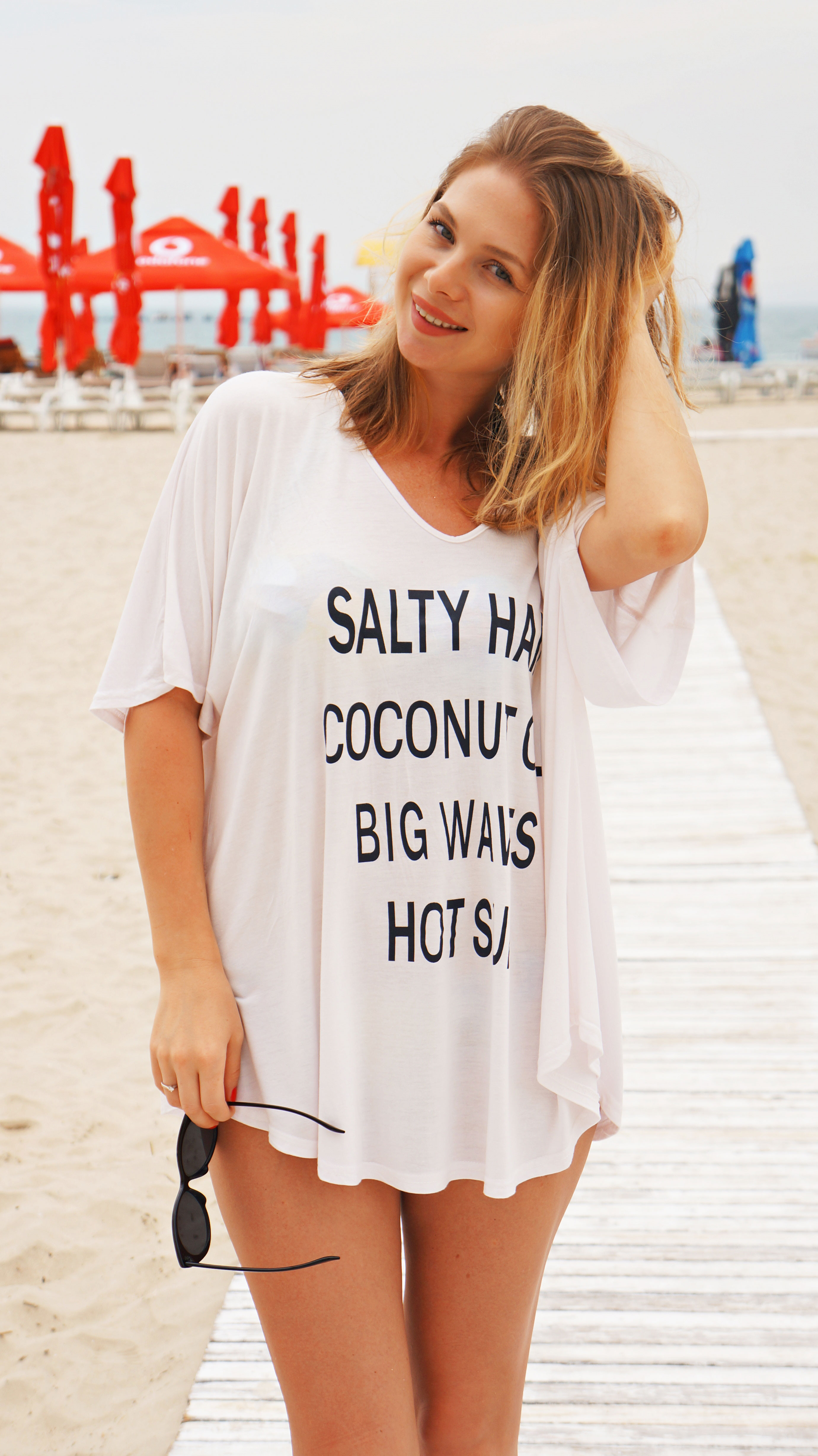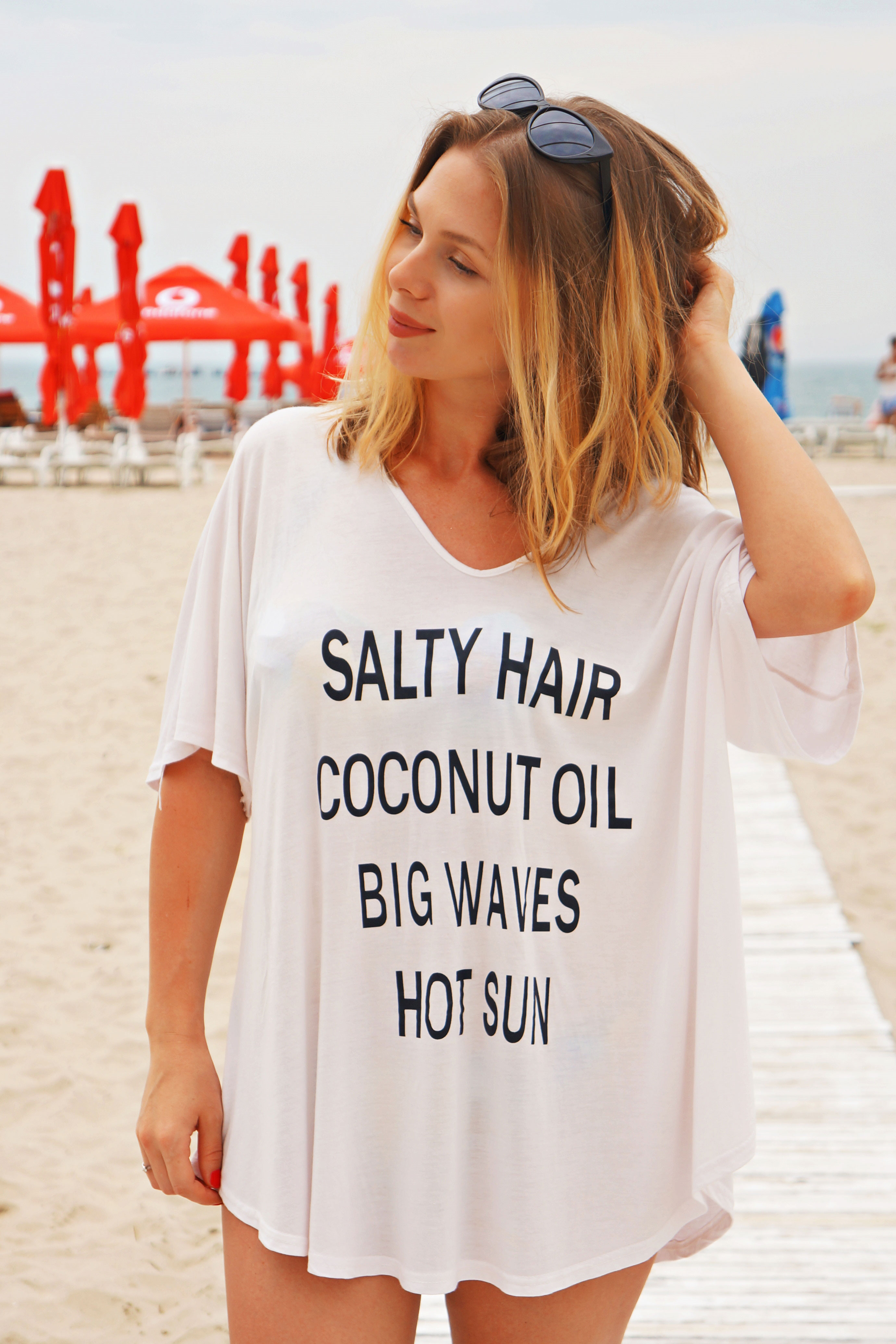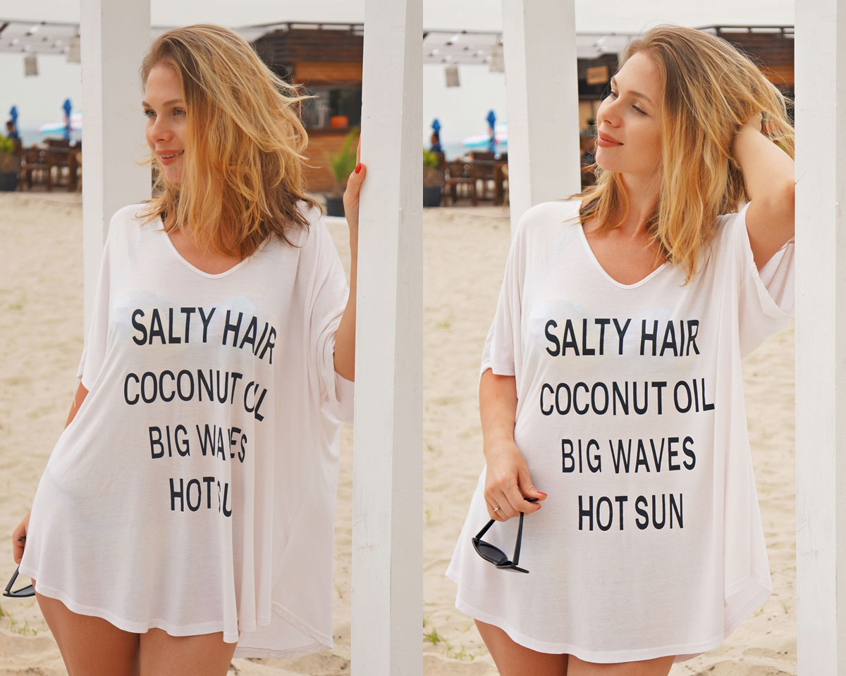 Dacă mă urmăriți pe contul de Instagram înseamnă că știți deja de mica escapadă la mare de unde ne-am întors cu bateriile încărcate, sau cel puțin așa vreau eu să cred. A fost și soare și vânt și cald și rece, apa gheață și nisipul fin. Iar pentru prima dată în viața mea am văzut curcubeu în mare, hihi. Sâmbătă am avut grijă să îmi aplic crema cu factor de protecție dar asta după ce mă tolănisem puțin pe șezlong. M-a păcălit vântul și câțiva nori și am zis că nu e soare de bronz dar uite cum m-am trezit eu seara ușor rumenită. Nu mai pot să mă spăl cu mănușa mea preferată de baie, scrubul cu mirosul lui delicios de cocos nici nu vreau să-l văd iar hainele trebuie să fie cât mai lejere și moi. Cel puțin pentru câteva zile. Tricoul luat de pe Zaful s-a nimerit să ajungă exact la timp. Chiar dacă m-a dezamăgit puțin mărimea (universală pe site dar XXL în realitate), materialul e atât de moale și plăcut (bumbac) încât l-am purtat cu cel mai mare drag. De mesajul simpatic nu mai vrobesc că doar asta m-a făcut să îl comand 😀 .
