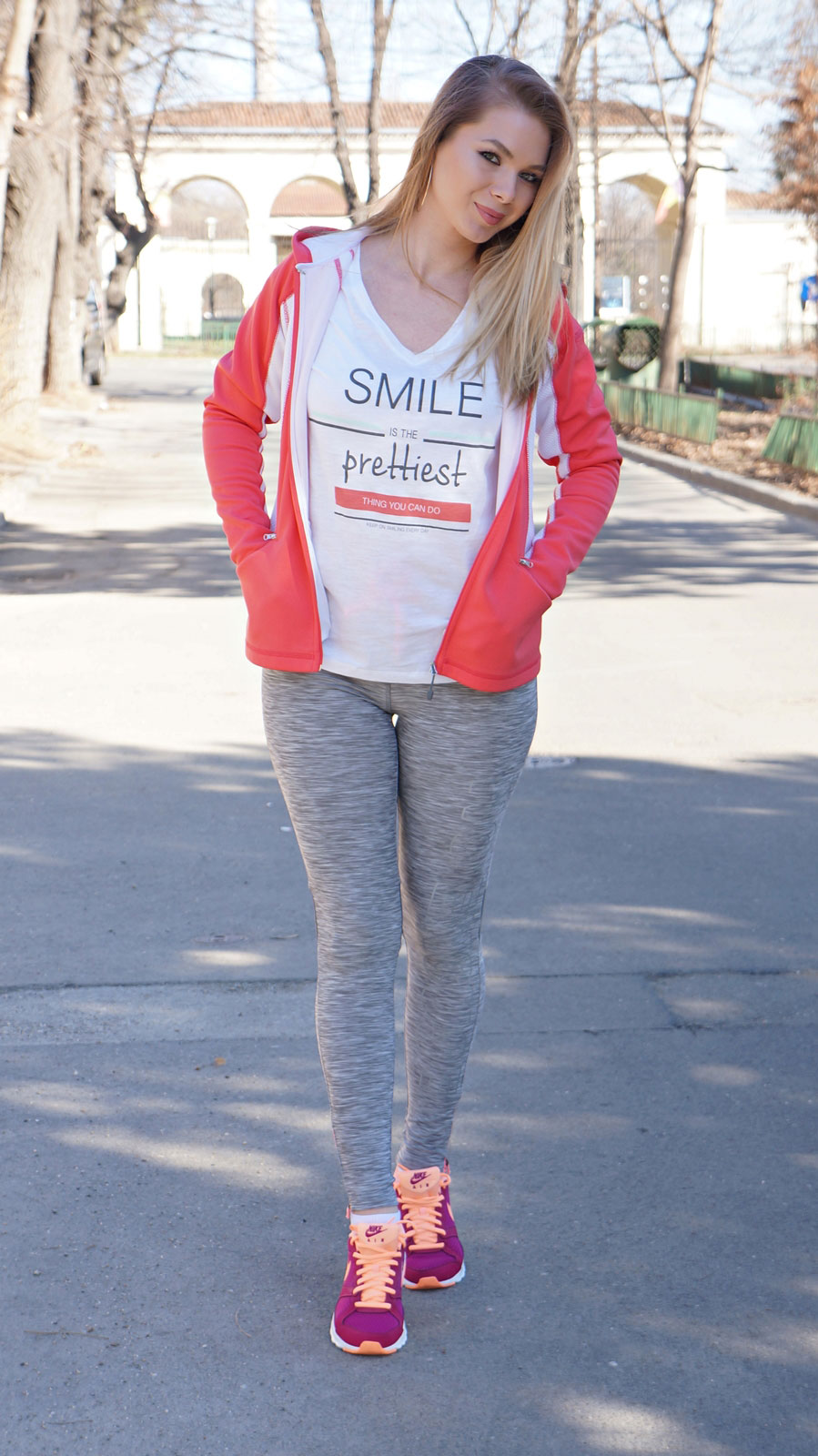 Și-a fost așa de frumos în weekend, m-am bucurat nespus de vremea frumoasă, am făcut poze și în sfârșit un nou video pentru canalul meu de YOUTUBE, yeee. O dată cu primăvara l-am trezit și pe el 😀 . Am încercat niște exerciții în aer liber după care m-am răzgândit și-am rămas doar la câteva fâțâieli în fața camerei, prezentând ținuta sport și atât. Înainte să mă certați, luați în considerare că era totul planificat, am ieșit să facem poze, de-asta e machiajul ceva mai strident. Ca să fiu sinceră, în realitate chiar merg la sală machiată. Pentru că merg imediat după muncă și mă opresc direct acolo. Desigur, aș putea să mă folosesc de șervețele demachiante dar nu pot să fac ceva atât de intim la sală. Glumesc 😆 . Dar chiar nu mă simt confortabil să fac asta. După demachiere eu simt nevoia să mă spăl, să mă cremuiesc, nu să transpir pe bicicletă și să am impresia că sunt lipicioasă. Și urâtă pe deasupra 🙂 .