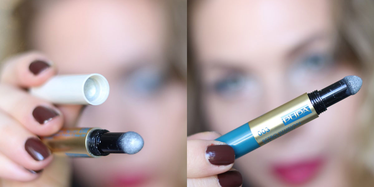 RETRO ILLUSION EYESHADOW este un Fard de Pleoape Dublu – Efect Luminos disponibil în 3 produse și 6 nuanțe: Retro Dreaming, Art deco. Vintage Chic. Este perfect pentru a crea efecte metalice și puncte luminoase. Au o textură compactă cu atingere neașteptat de cremoasă, se întinde ușor pe pleoape, culorile sunt absolut superbe și oferă un efect perlat, metalic. Mi s-a părut puțin dificil de blenduit, dar până la urmă am reușit. Și ambalajele sunt ceva nou, adică am mai întâlnit sistemul ăsta la colecția Summer în L.A și deși credeam că sunt stângace și nu mă pricep, acum mi se pare că sunt foarte ușor de manevrat. Fiecare conțin o nuanță îndrăzneață într-un capăt și în celălalt capăt o nuanță mult mai deschisă. Se deșurubează, iese la iveală un vârf din burețel, colorat iar fardul propriu zis este de fapt în interiorul capacului. Este cam același sistem ca la ștampilă, se simte un arc în capac și ca să pui fard pe vârf pur și simplu îl împingi puțin în capac. Nu știu cât de înțeleasă m-am făcut, dar poate pozele sunt mai explicite. Dacă nu, vizitați un magazin Pupa Milano și jucați-vă cu un tester 🙂 .