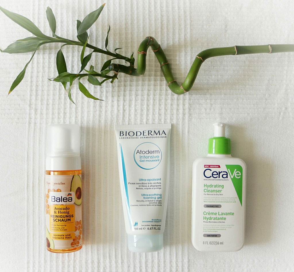 Spuma de curățare Balea, din magazinul DM și Gelul spumant Atoderm Intensive de la Bioderma