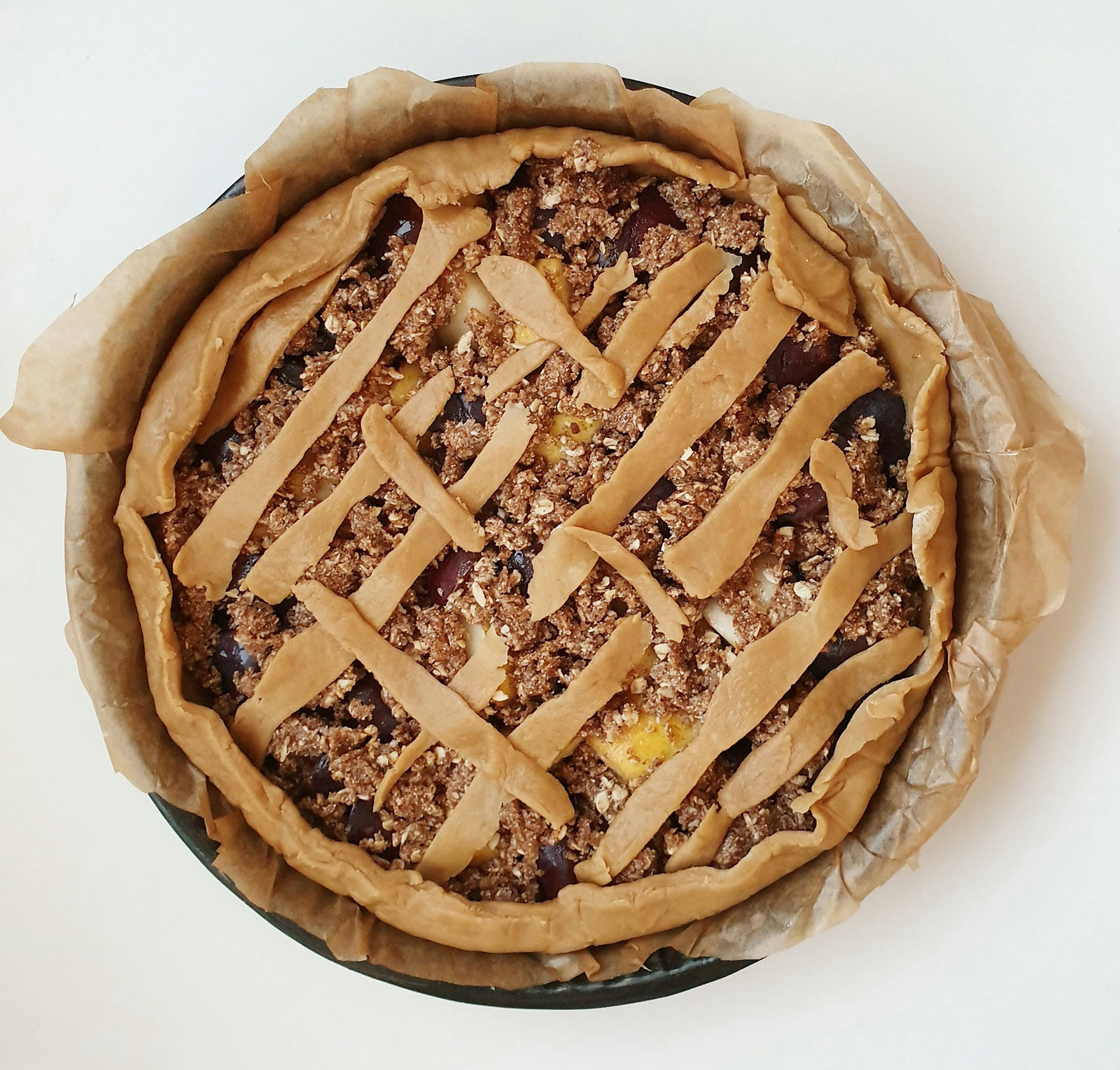 Întindem aluatul pe masă, în formă rotundă sau în ce formă are tava,, dar puțin mai mare astfel încât să ajungă și pe pereții tăvii. Îl așezăm cu grijă în tavă, peste hârtia de copt, presăm ușor cu degetele și apoi adăugăm fructele aranjate frumos sau nu, în funcție de preferințe.