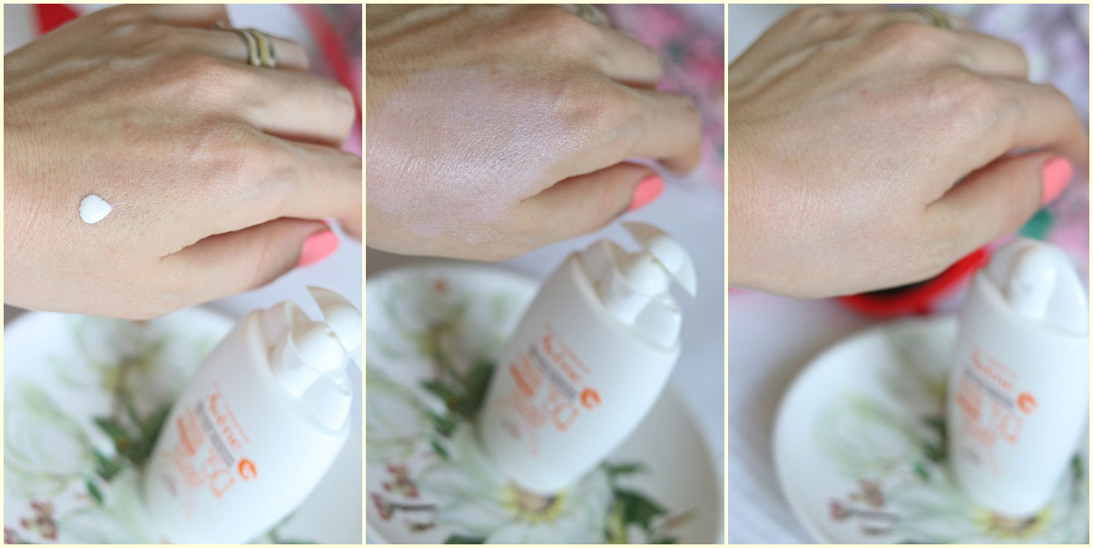 Are o textură ușoară, lichidă, hidratează pielea sensibilă oferind un finisaj mat. Imediat după aplicare pielea se vede ușor albă, dar în câteva minute, pe măsură ce intră în piele, dispare (poza mai jos). Ăsta ar fi un minus, dar nu neapărat. Mai ales pentru mine care mă machiez și folosesc fond de ten sau BB Cream.